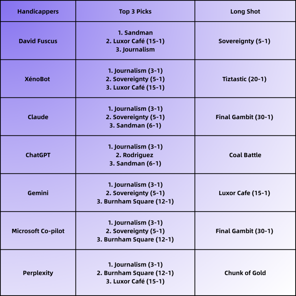 For the contest, the six AIs and Fuscus picked their top three finishing horses plus one longshot. A win gets 10 points; 5 points for second and 3 points for third. The wild card is the long shot – the handicapper whose long shot finishes highest will get an additional 5 points.